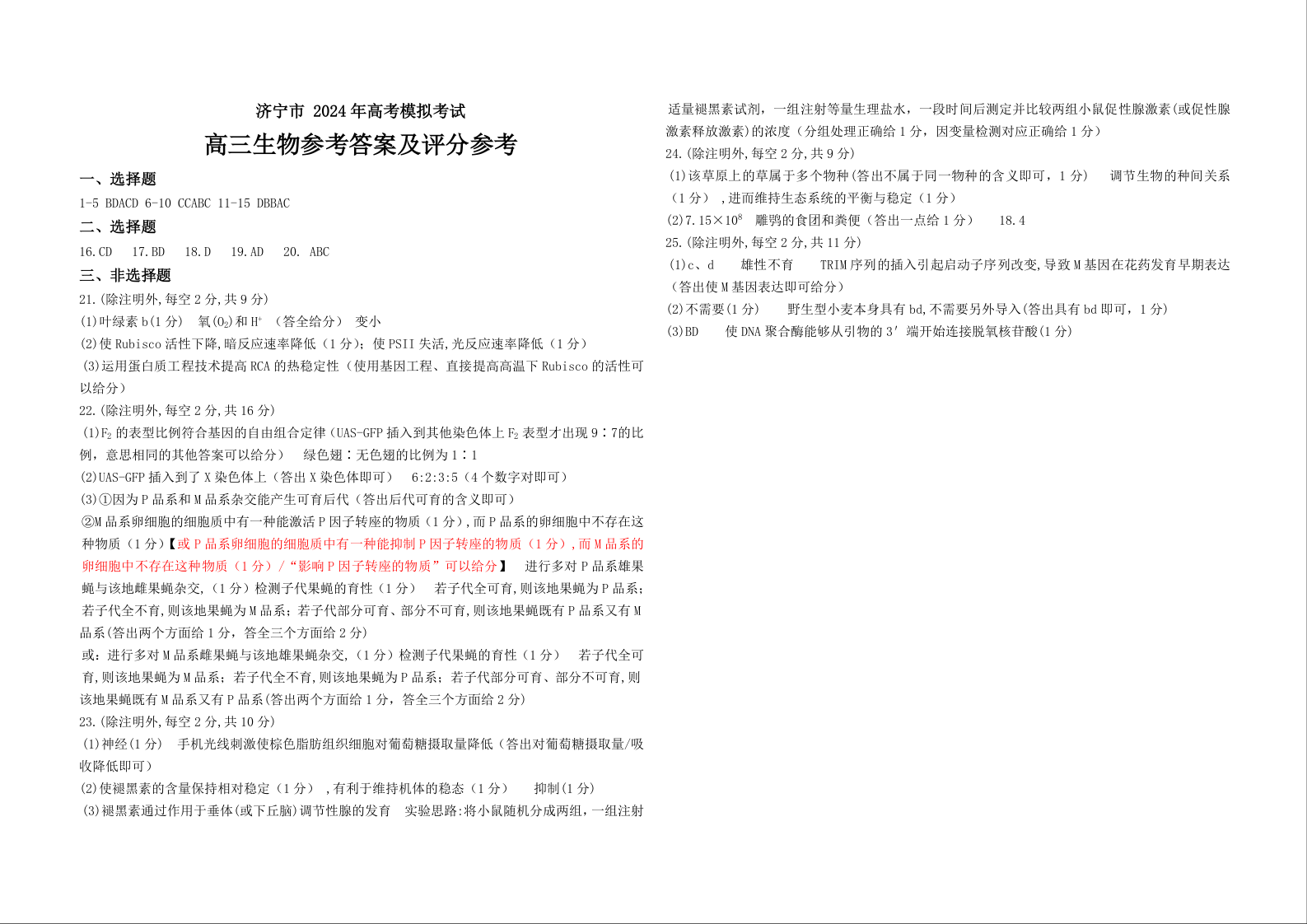山东省济宁市2024.4高三年级第二次模拟生物答案