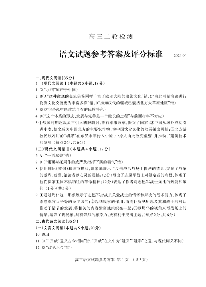1山东省泰安市2024.4高三年级第二次模拟语文答案