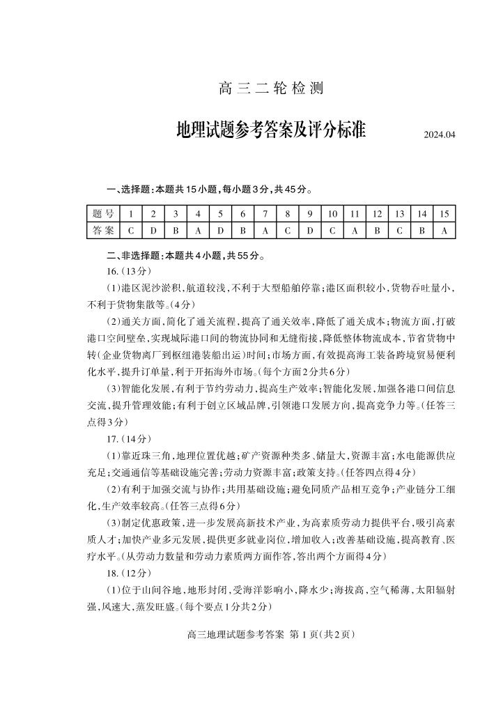 山东省泰安市2024.4高三年级第二次模拟地理答案
