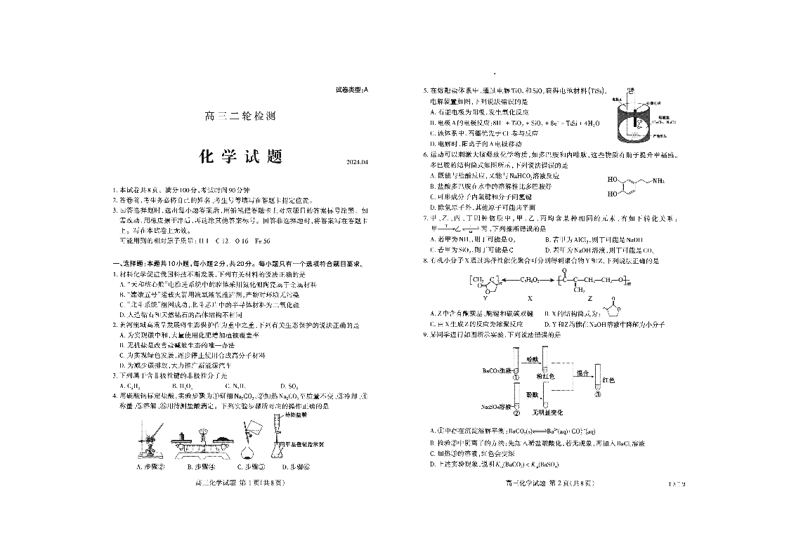 山东省泰安市2024.4高三年级第二次模拟化学