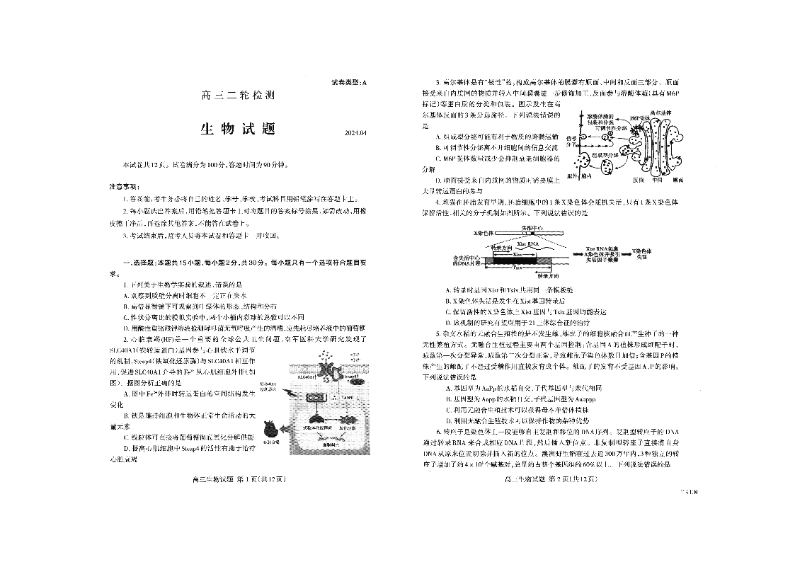 山东省泰安市2024.4高三年级第二次模拟生物