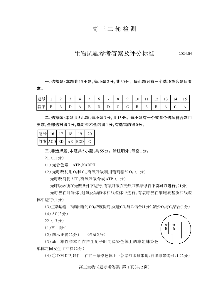 山东省泰安市2024.4高三年级第二次模拟生物答案