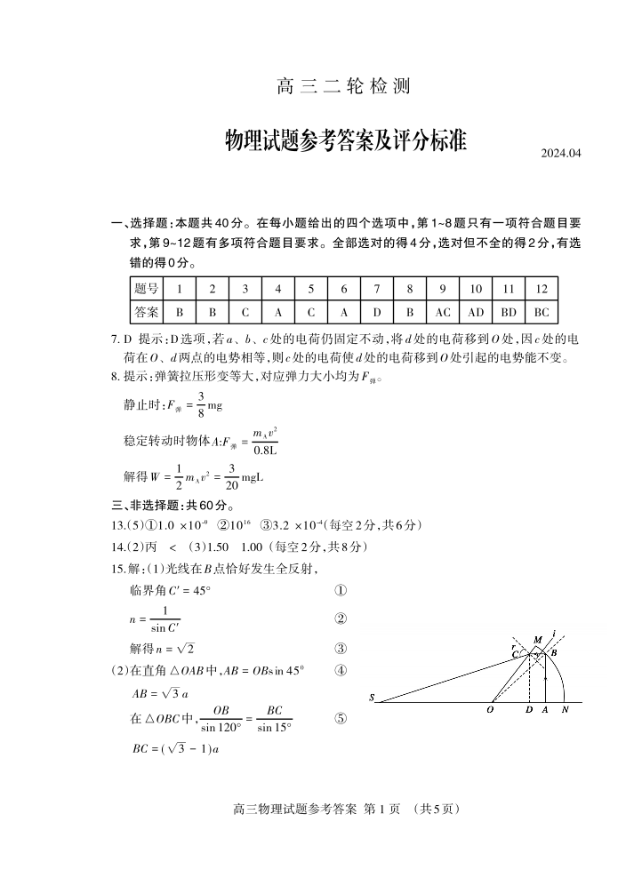 山东省泰安市2024.4高三年级第二次模拟物理答案