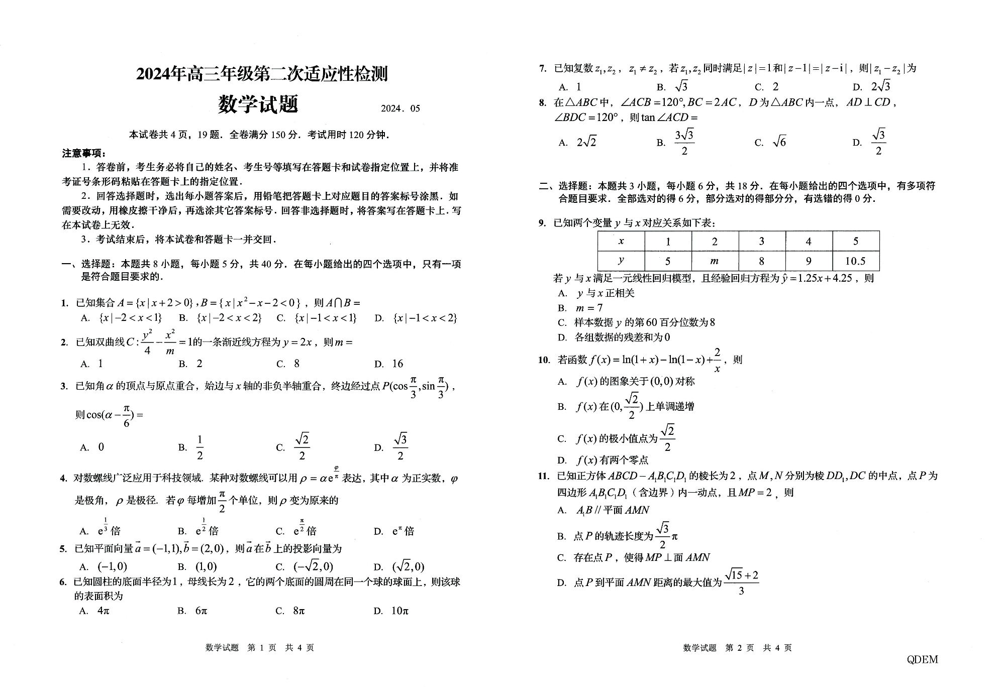 2山东省青岛市2024.5高三年级第二次模拟数学