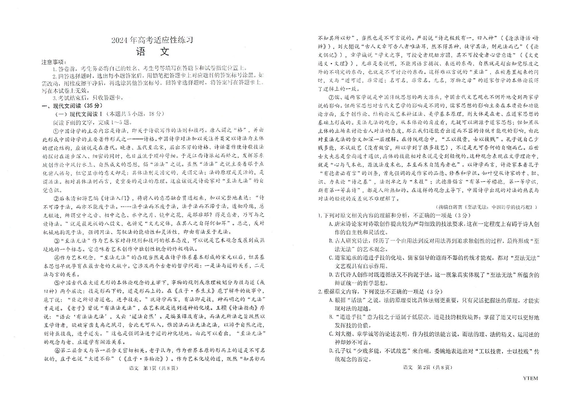 1山东省烟台市2024.5高三年级第二次模拟语文