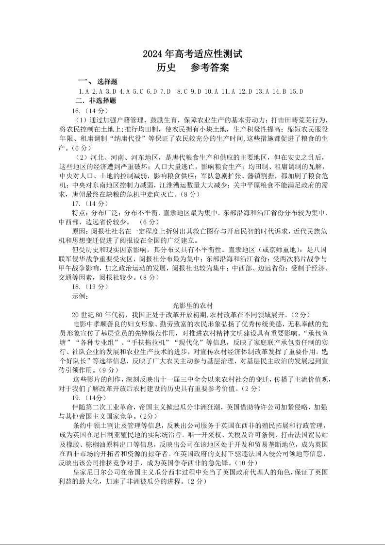山东省烟台市2024.5高三年级第二次模拟历史答案