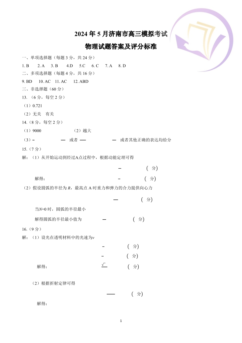 山东省济南市2024.5高三年级第三次模拟物理答案
