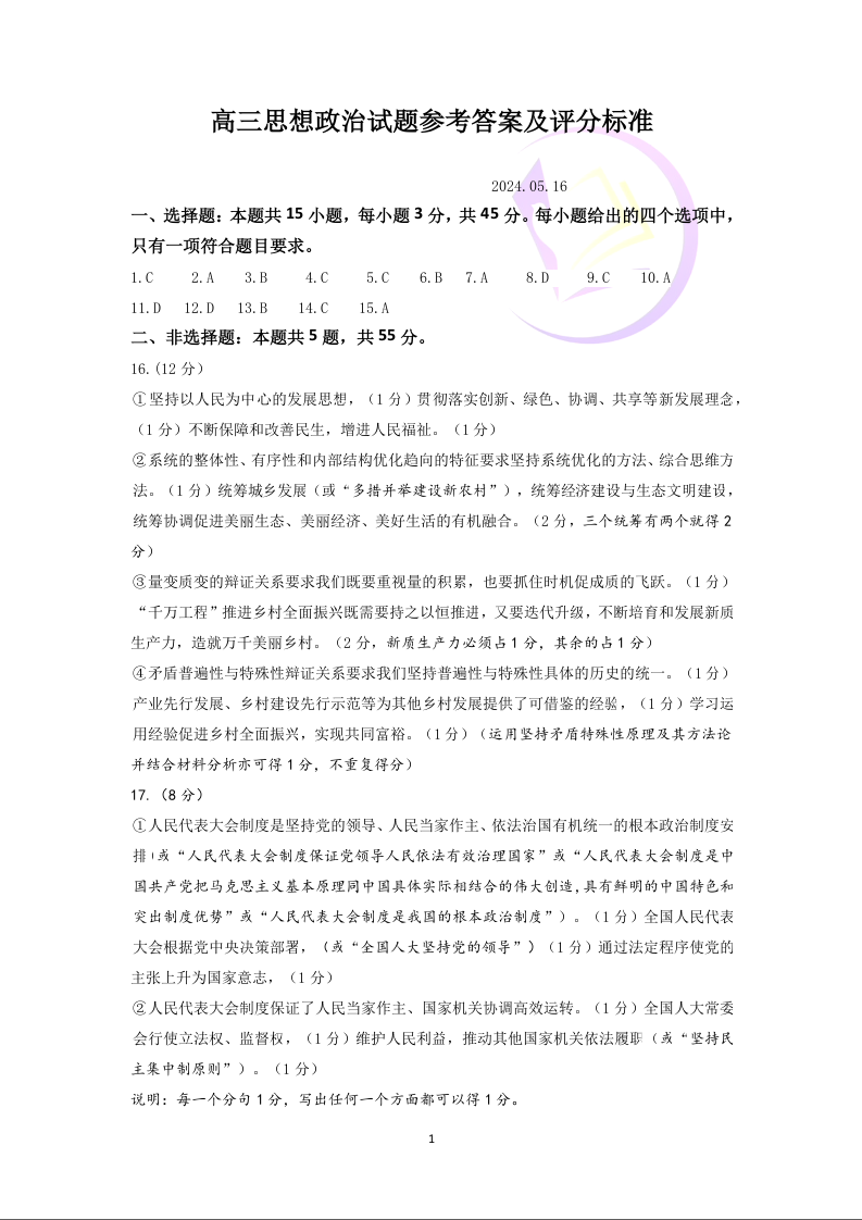 山东省济南市2024.5高三年级第三次模拟政治答案