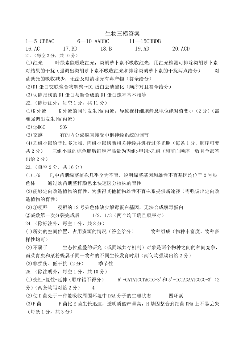 山东省济宁市2024.5高三年级第三次模拟生物答案