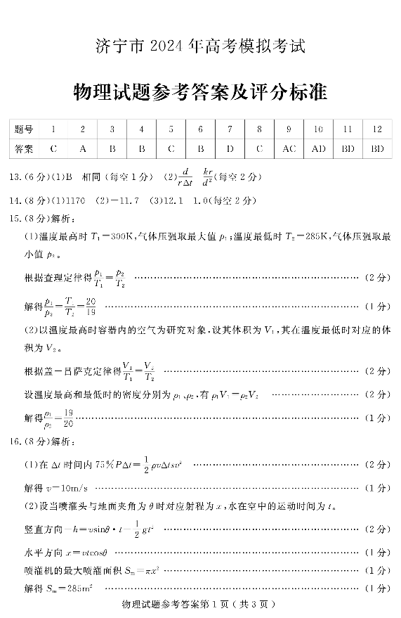 山东省济宁市2024.5高三年级第三次模拟物理答案