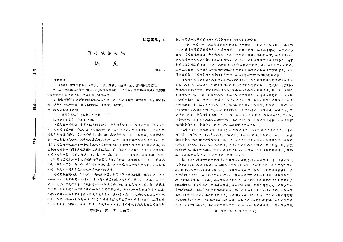 山东省潍坊市2024.5高三年级第三次模拟语文