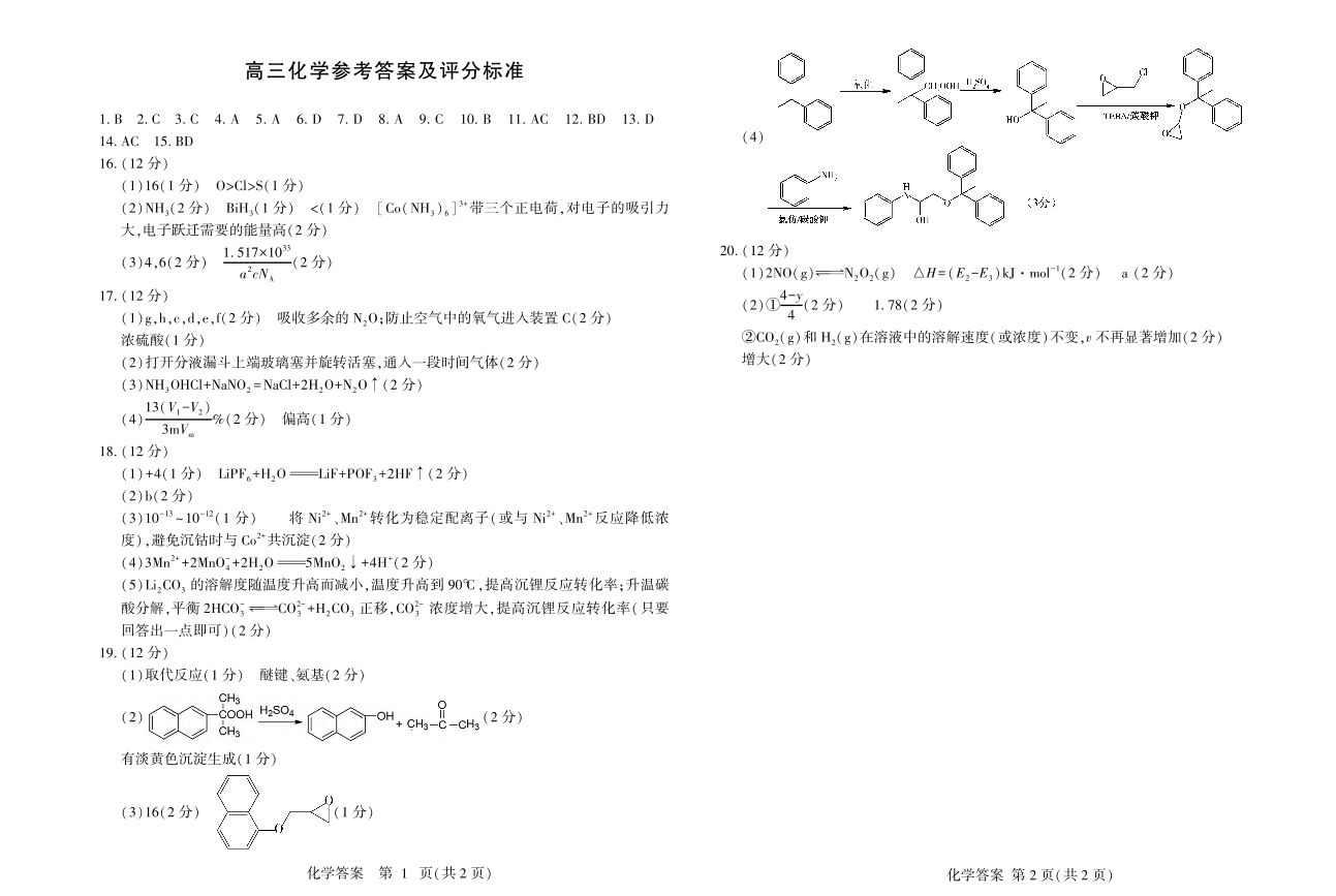 山东省潍坊市2024.5高三年级第三次模拟化学答案