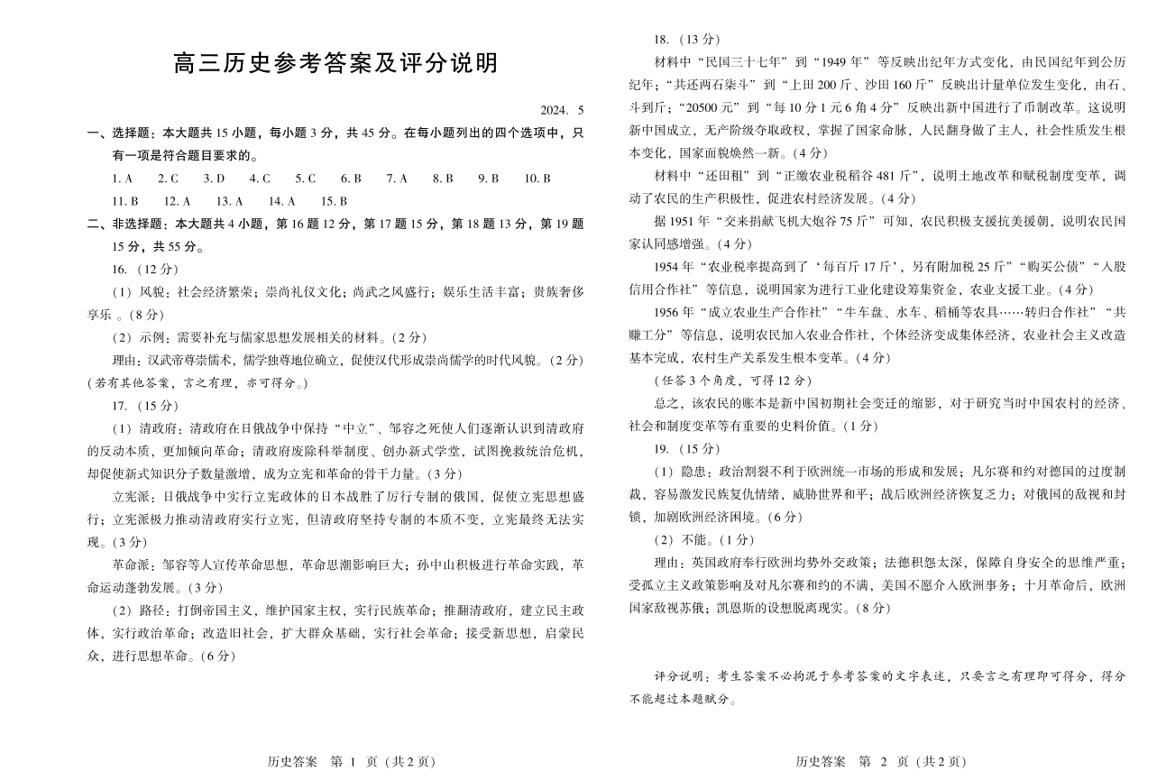 山东省潍坊市2024.5高三年级第三次模拟历史答案
