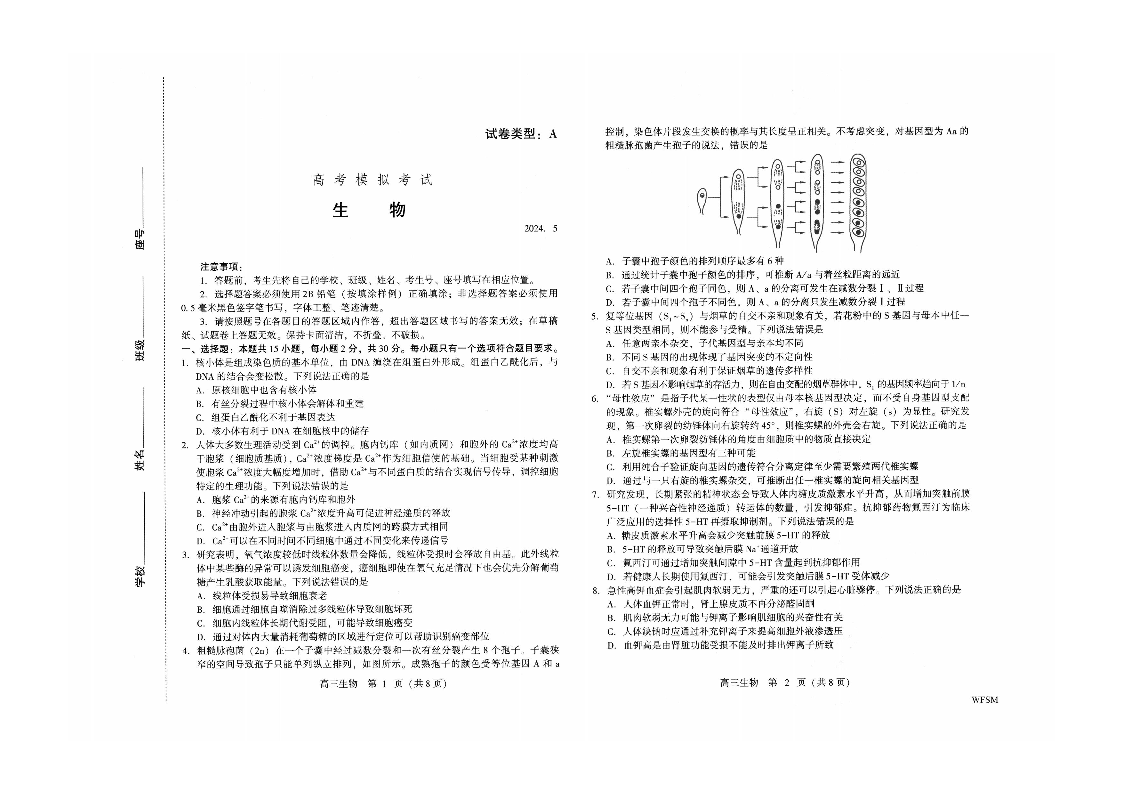 山东省潍坊市2024.5高三年级第三次模拟生物