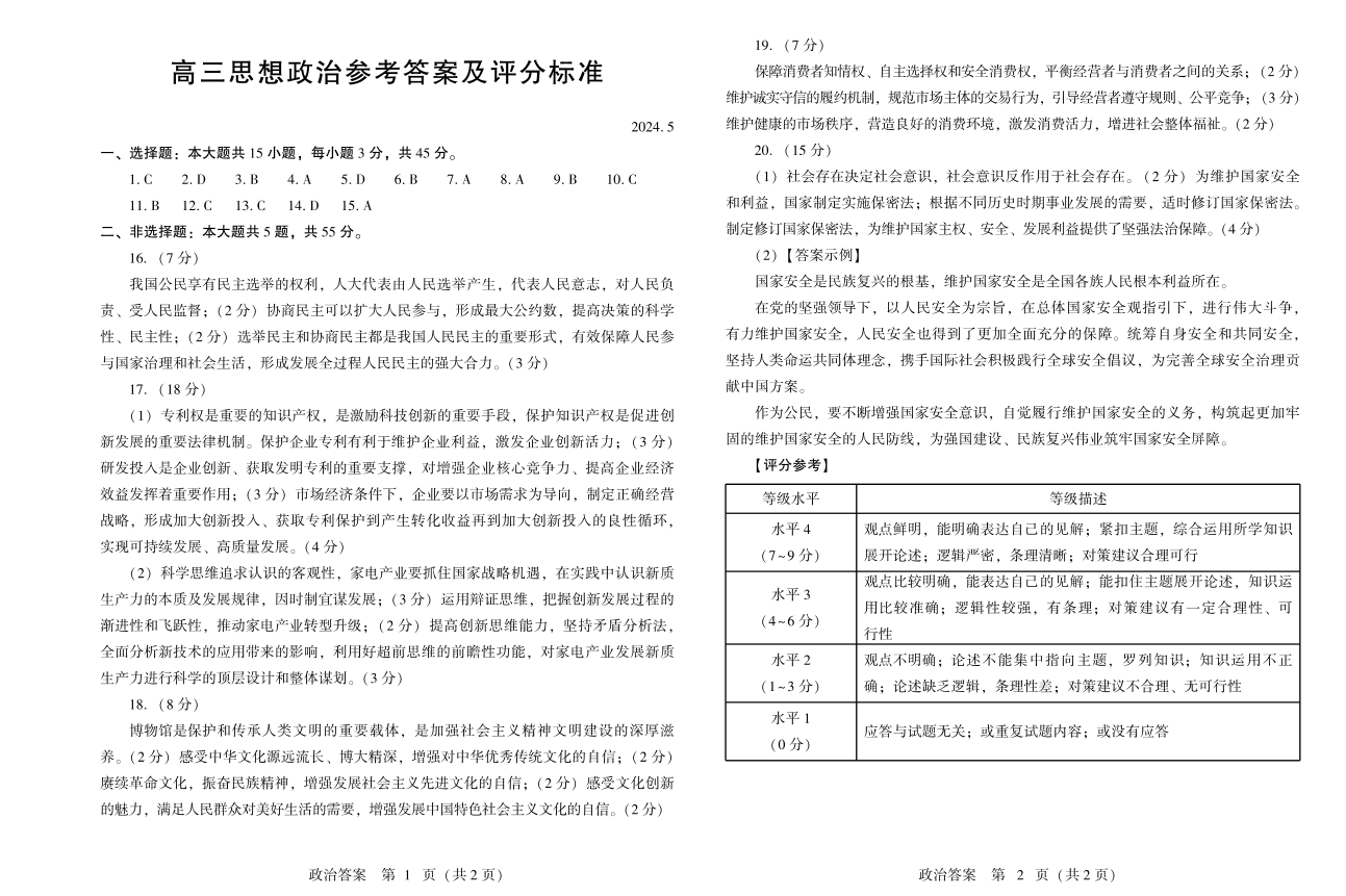 山东省潍坊市2024.5高三年级第三次模拟政治答案