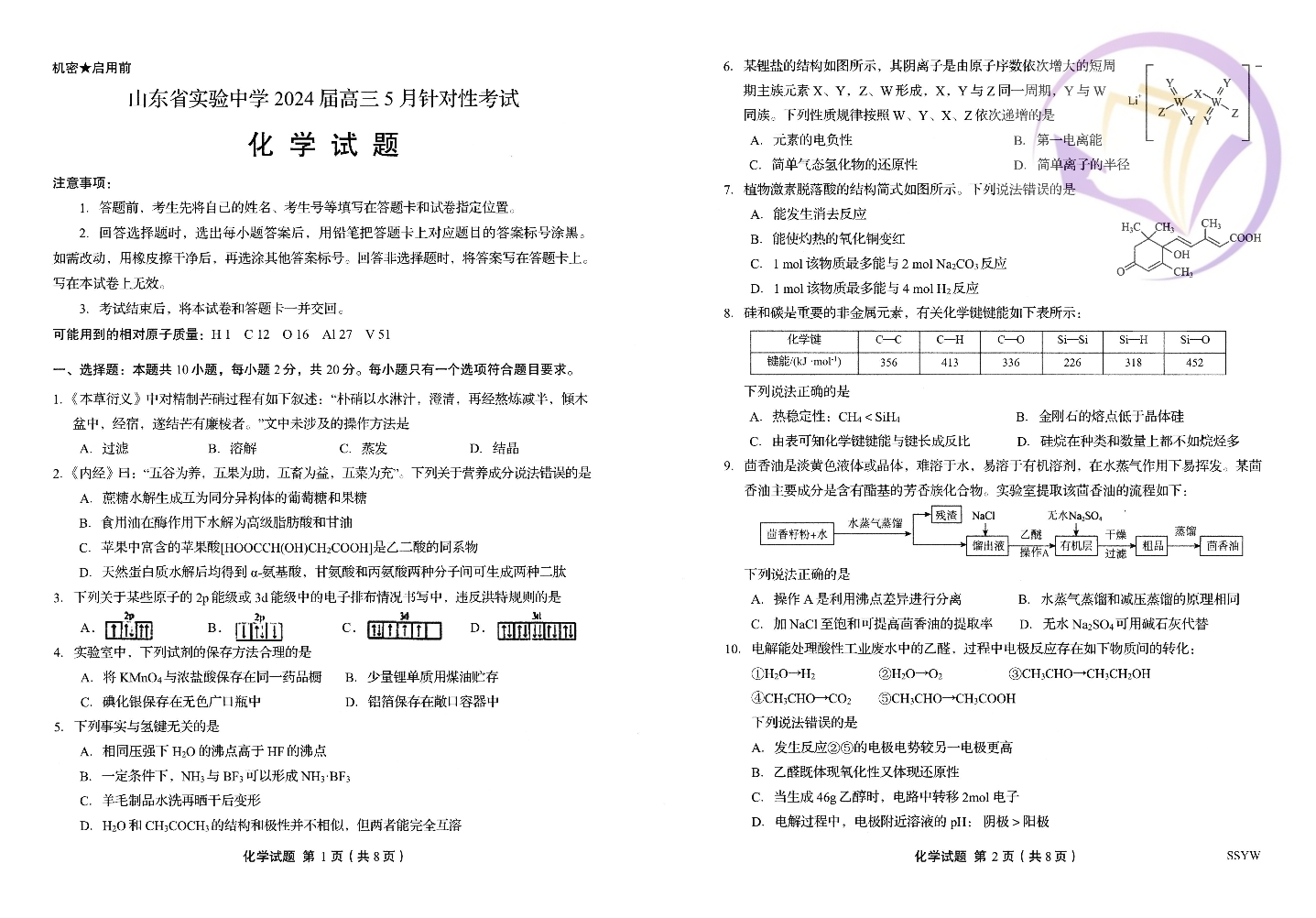 山东省实验中学2024.5高三年级针对性考试化学