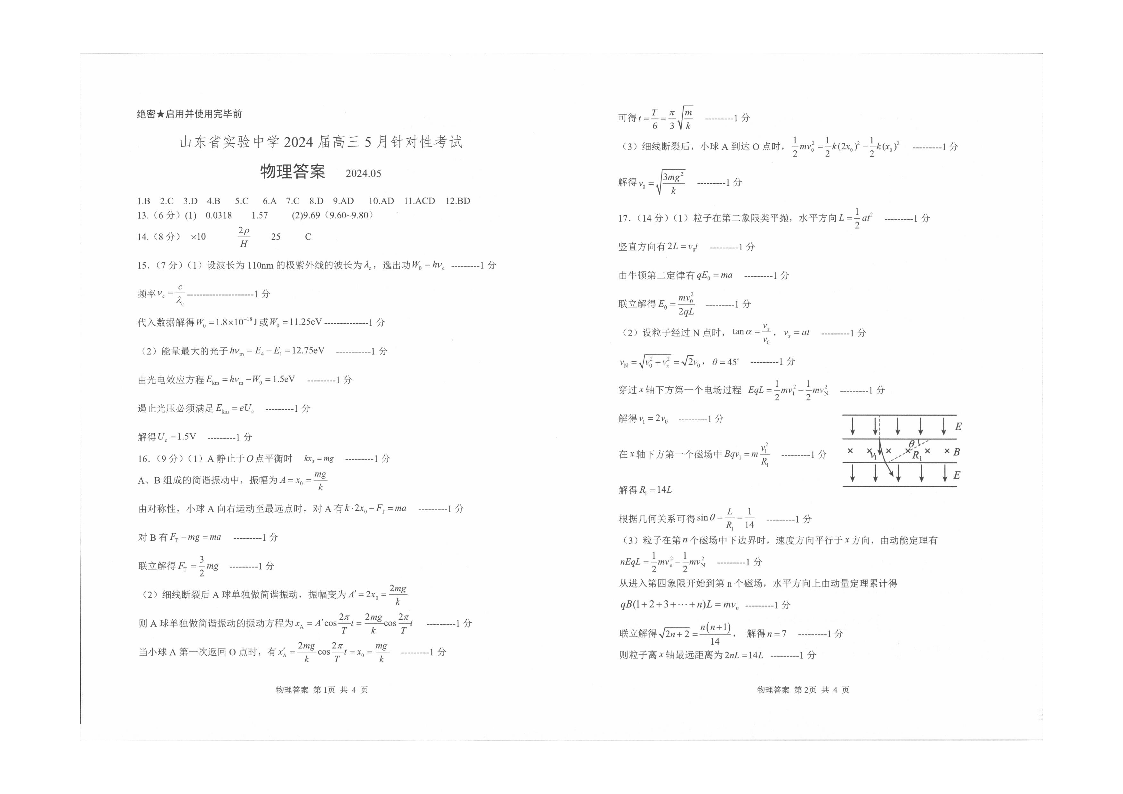 山东省实验中学2024.5高三年级针对性考试物理答案