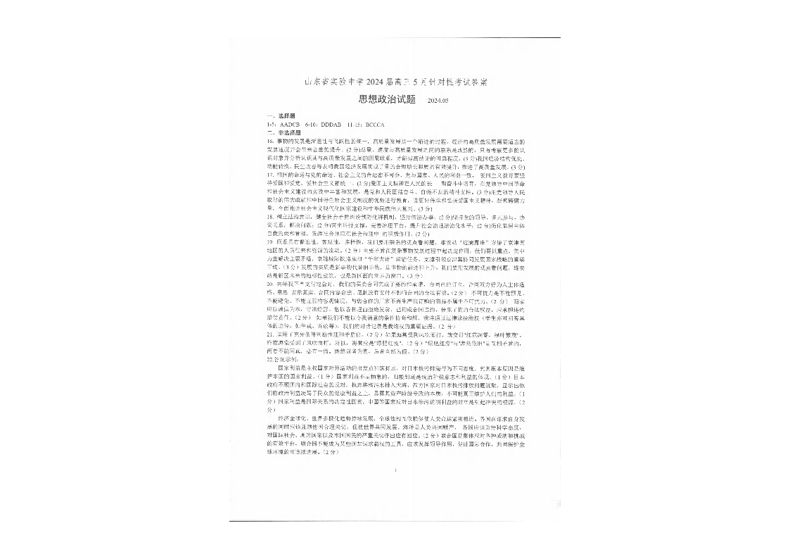 山东省实验中学2024.5高三年级针对性考试政治答案