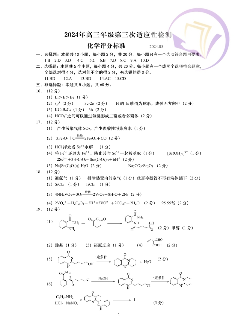 山东省青岛市2024.5高三年级第三次模拟化学答案