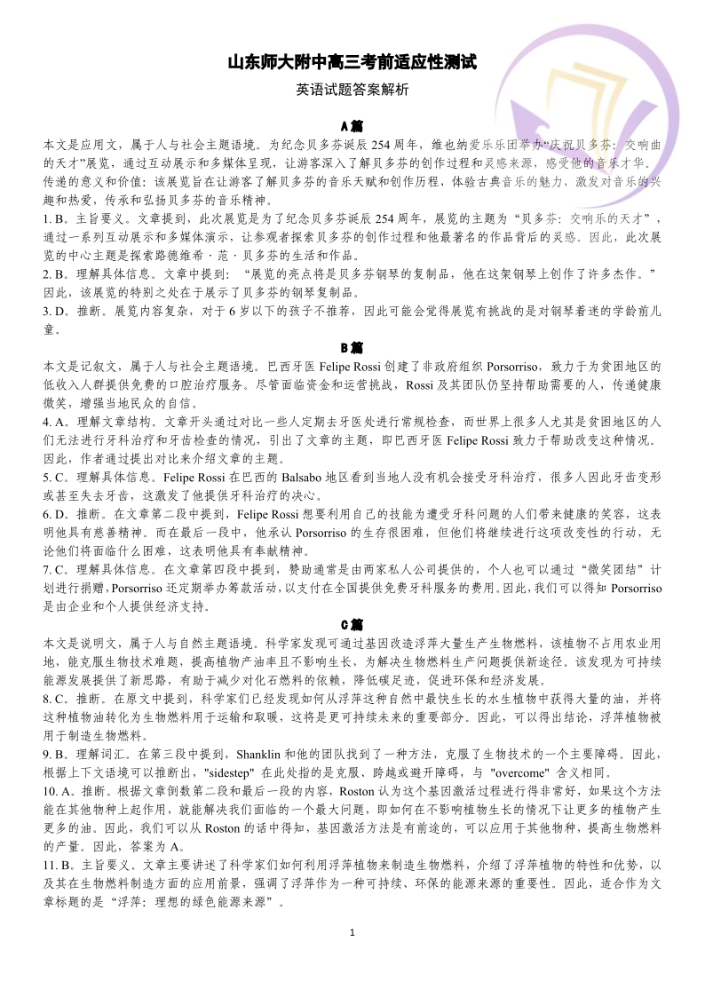 3山东省师大附中2024.6高三年级考前模拟英语答案
