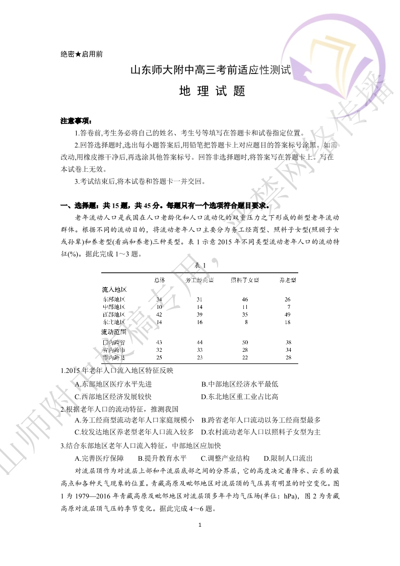 山东省师大附中2024.6高三年级考前模拟地理