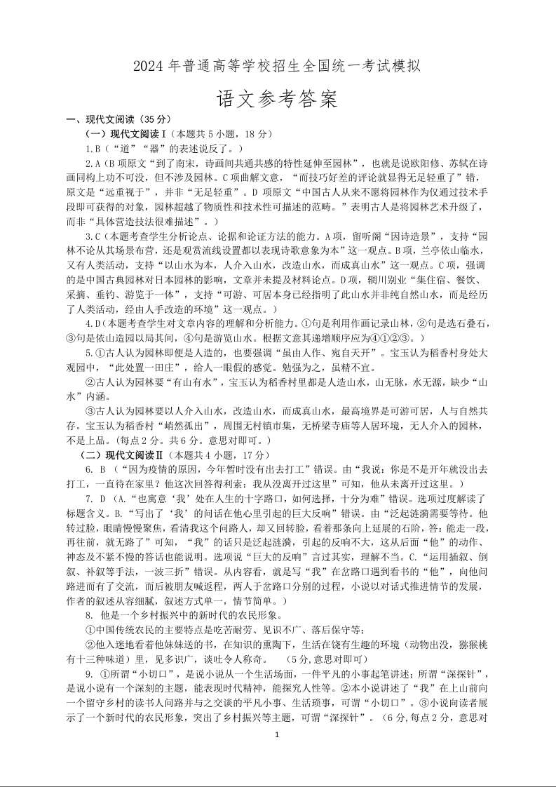 1山东省潍坊市区域2024.6高三年级考前热身卷语文答案