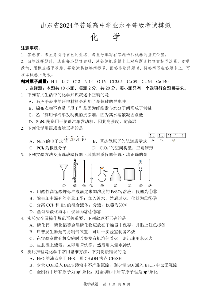 山东省潍坊市区域2024.6高三年级考前热身卷化学
