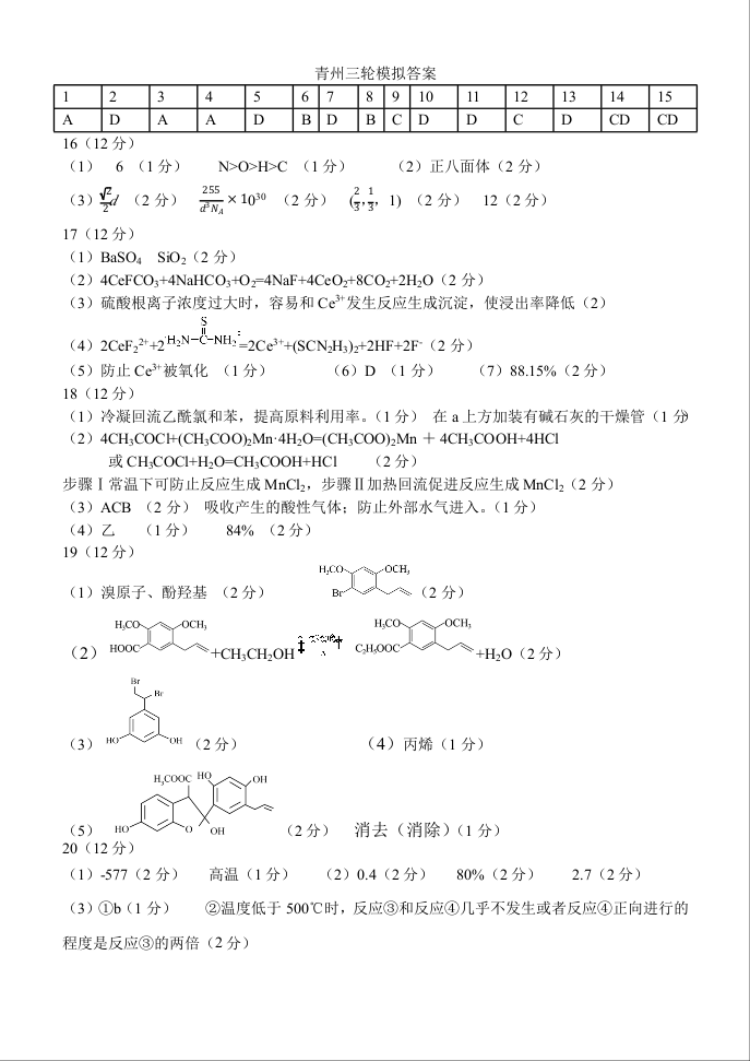 山东省潍坊市区域2024.6高三年级考前热身卷化学答案