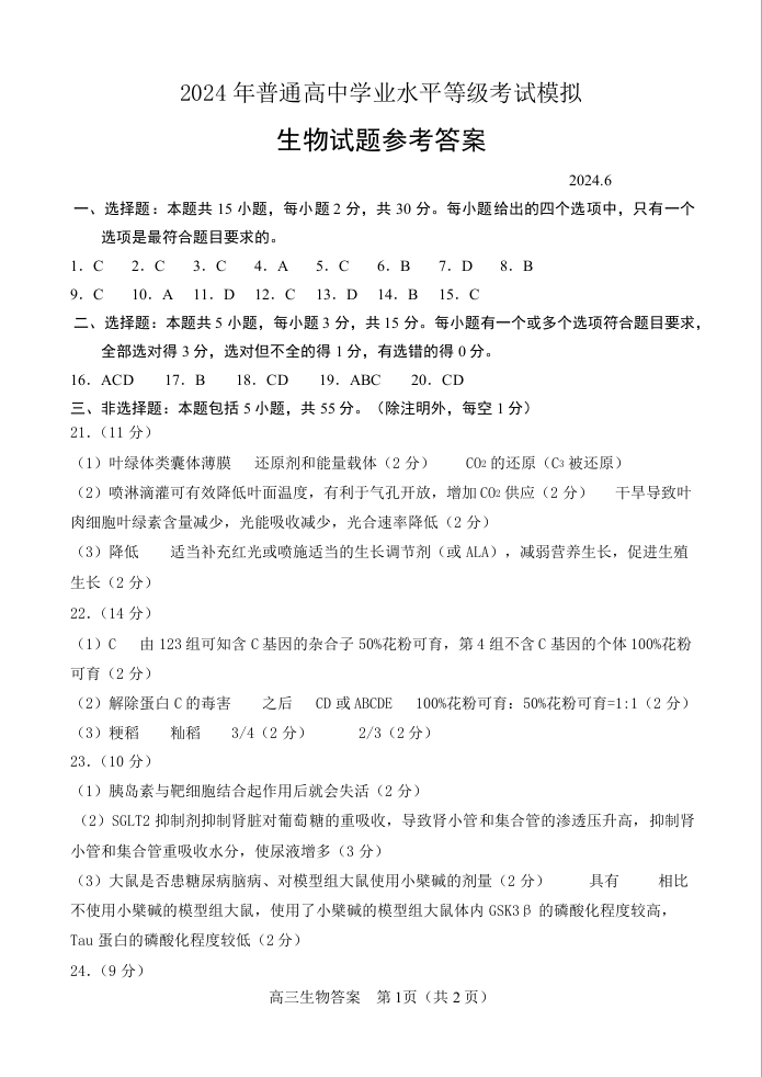 山东省潍坊市区域2024.6高三年级考前热身卷生物答案