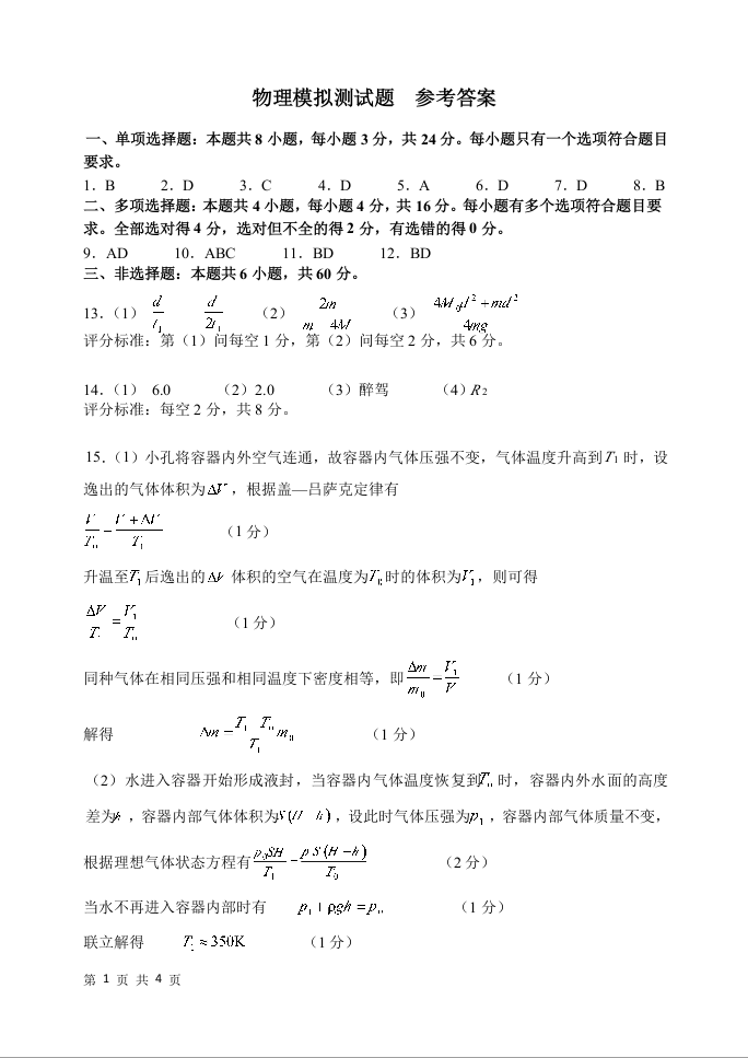 山东省潍坊市区域2024.6高三年级考前热身卷物理答案