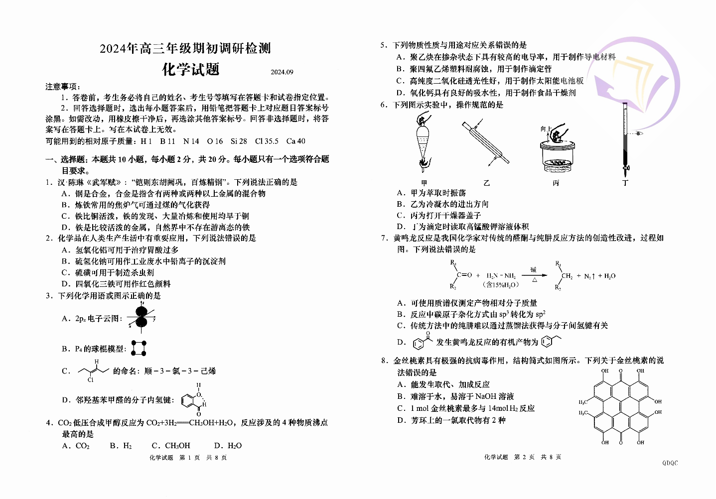 山东省青岛市2024.9高三期初调研试题化学