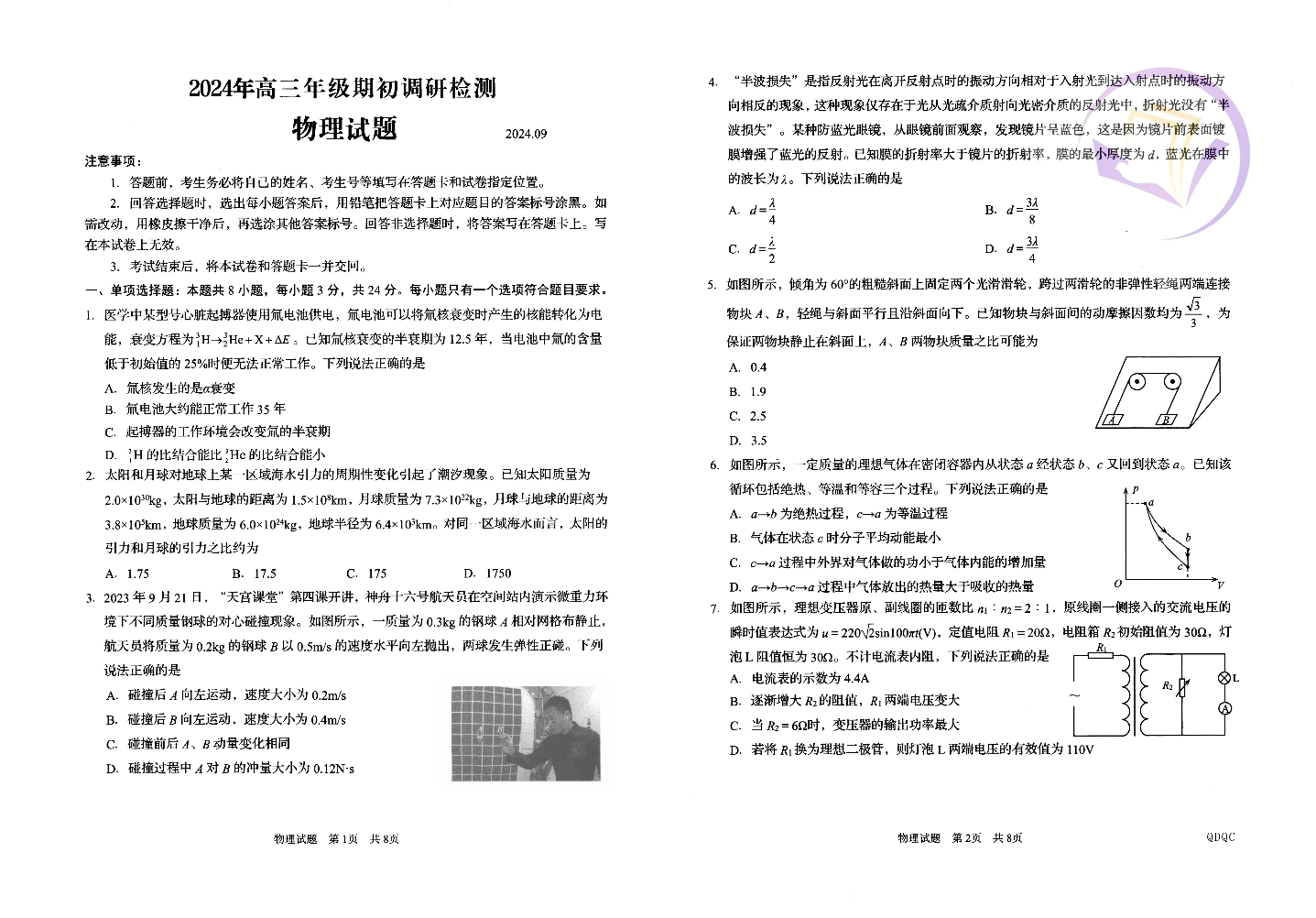 山东省青岛市2024.9高三期初调研试题物理