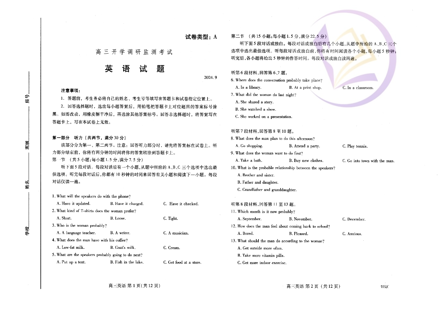 山东省潍坊市2024.9高三开学调研监测试题英语