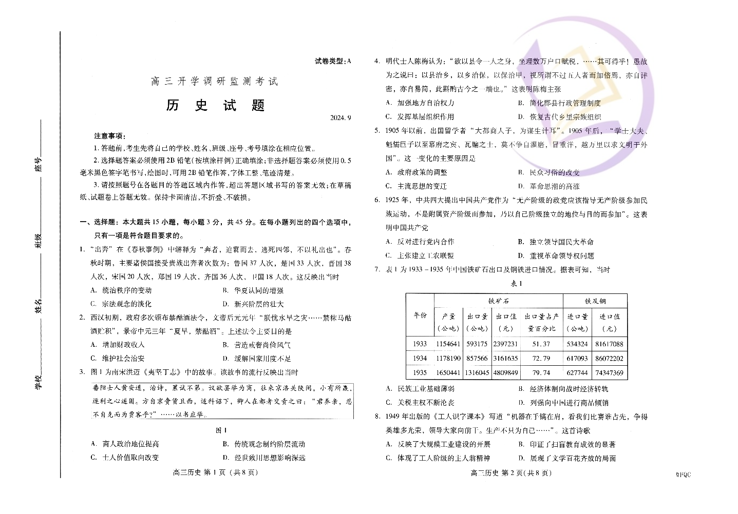 山东省潍坊市2024.9高三开学调研监测试题历史