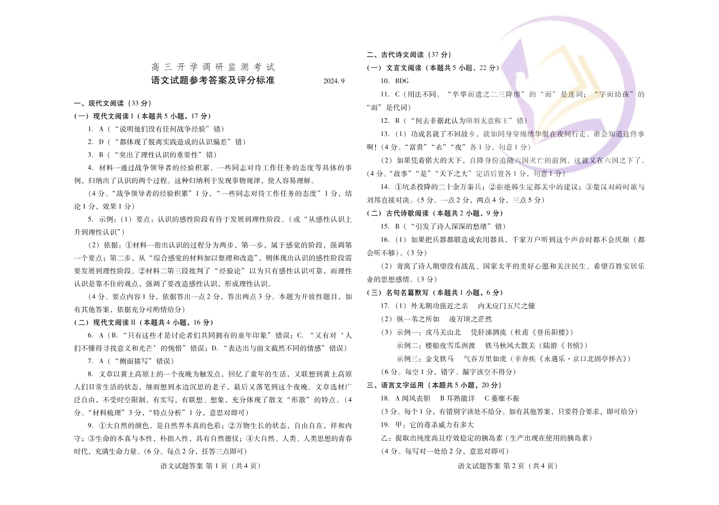 山东省潍坊市2024.9高三开学调研监测试题语文答案