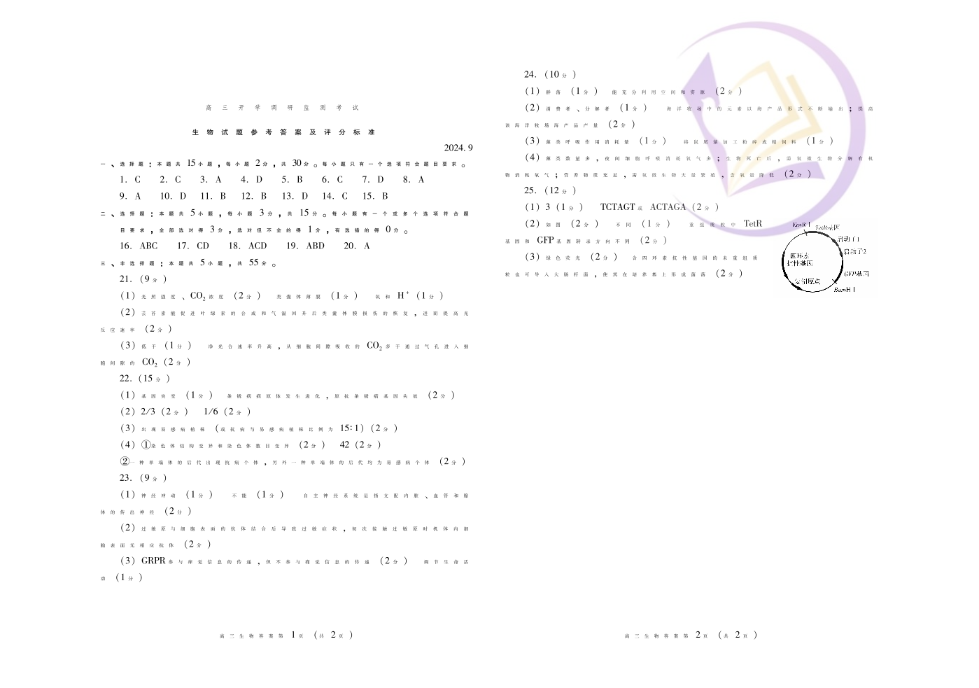 山东省潍坊市2024.9高三开学调研监测试题生物答案