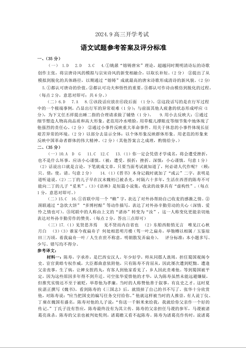 山东省济南市2024.9高三开学统一摸底考试语文答案