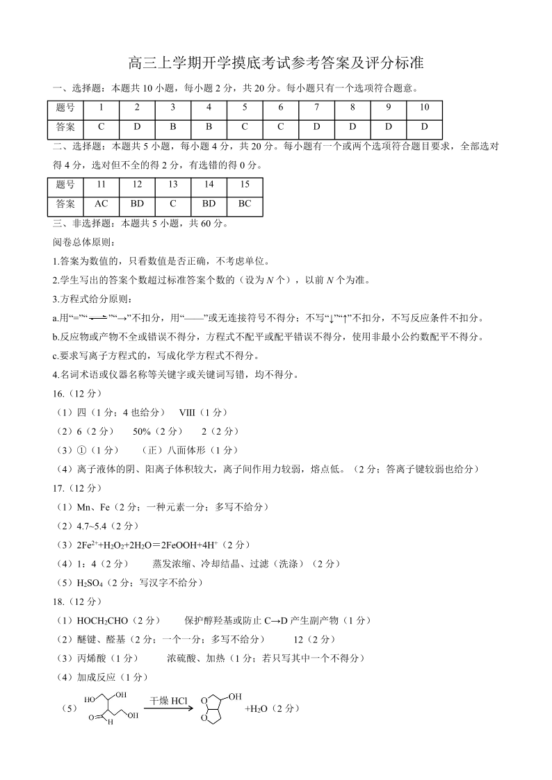 山东省济南市2024.9高三开学统一摸底考试化学答案