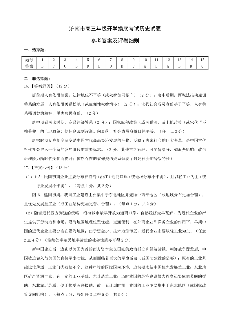 山东省济南市2024.9高三开学统一摸底考试历史答案