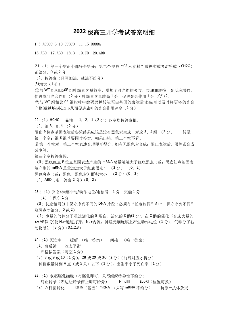 山东省济南市2024.9高三开学统一摸底考试生物答案
