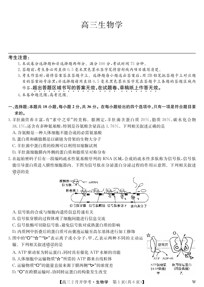湖北部分学校2023-2024学年下学期高三2月开学考试 生物