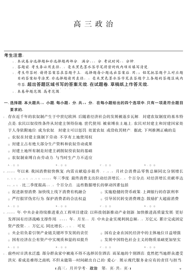 湖北部分学校2023-2024学年下学期高三2月开学考试 政治