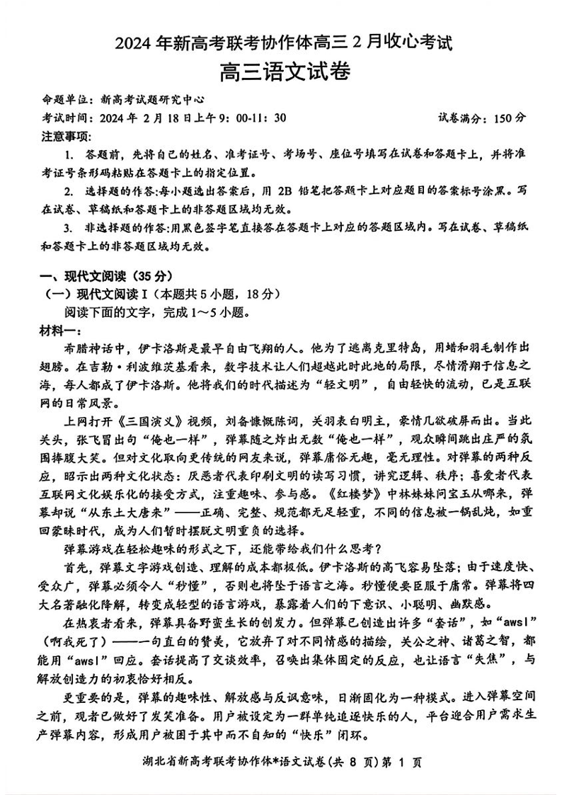 湖北省新高考联考协作体2023-2024学年高三下学期2月收心考试 语文