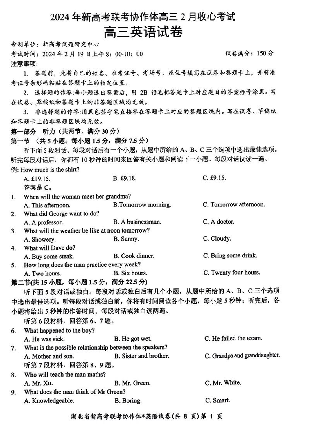 湖北省新高考联考协作体2023-2024学年高三下学期2月收心考试 英语