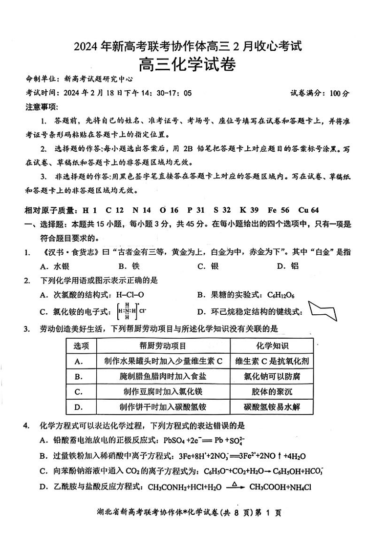 湖北省新高考联考协作体2023-2024学年高三下学期2月收心考试 化学
