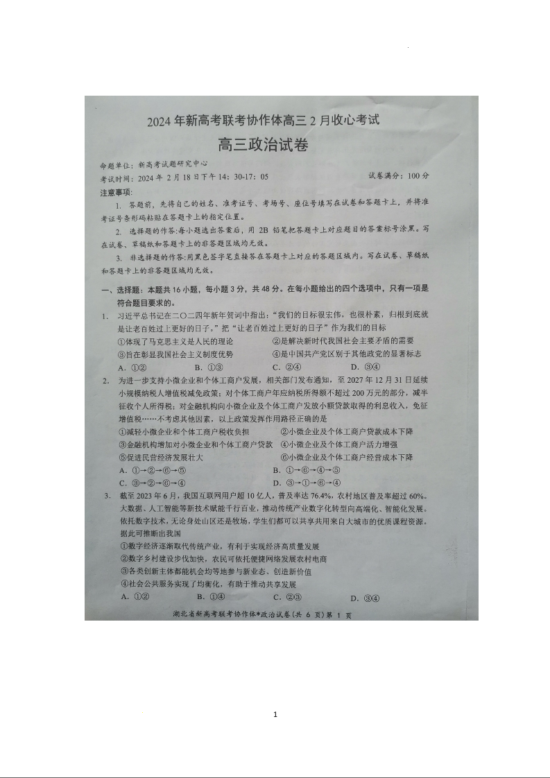 湖北省新高考联考协作体2023-2024学年高三下学期2月收心考试 政治