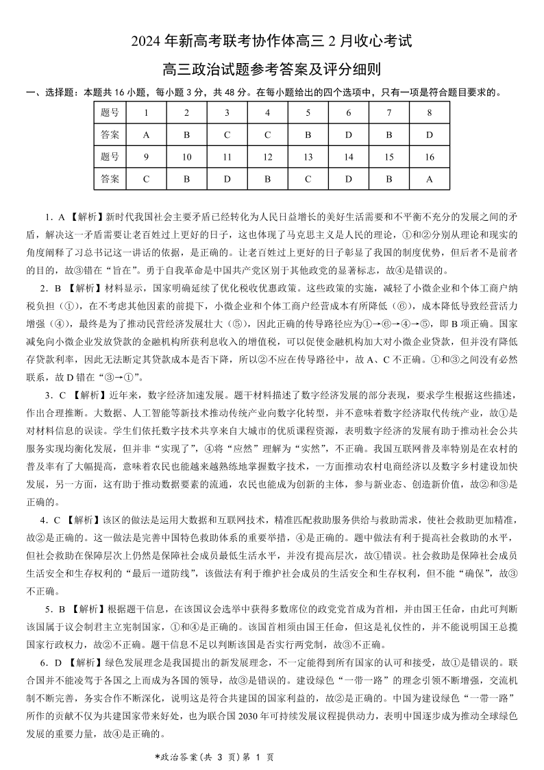 湖北省新高考联考协作体2023-2024学年高三下学期2月收心考试 政治答案