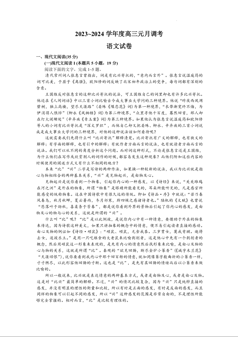 湖北省武汉市江岸区2023-2024学年高三上学期元月调考 语文