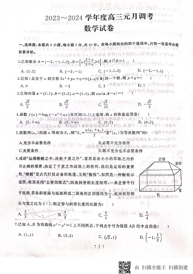 湖北省武汉市江岸区2023-2024学年高三上学期元月调考 数学