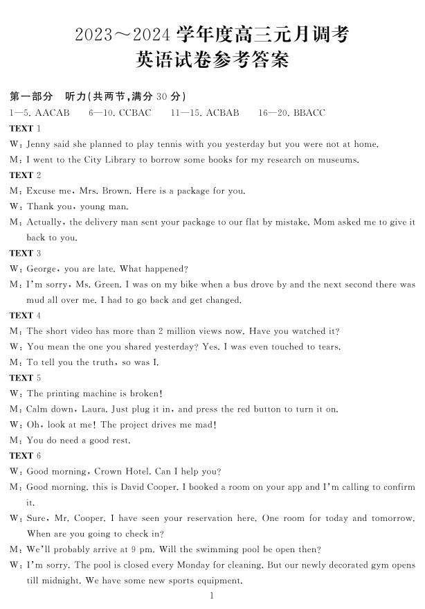 湖北省武汉市江岸区2023-2024学年高三上学期元月调考 英语答案